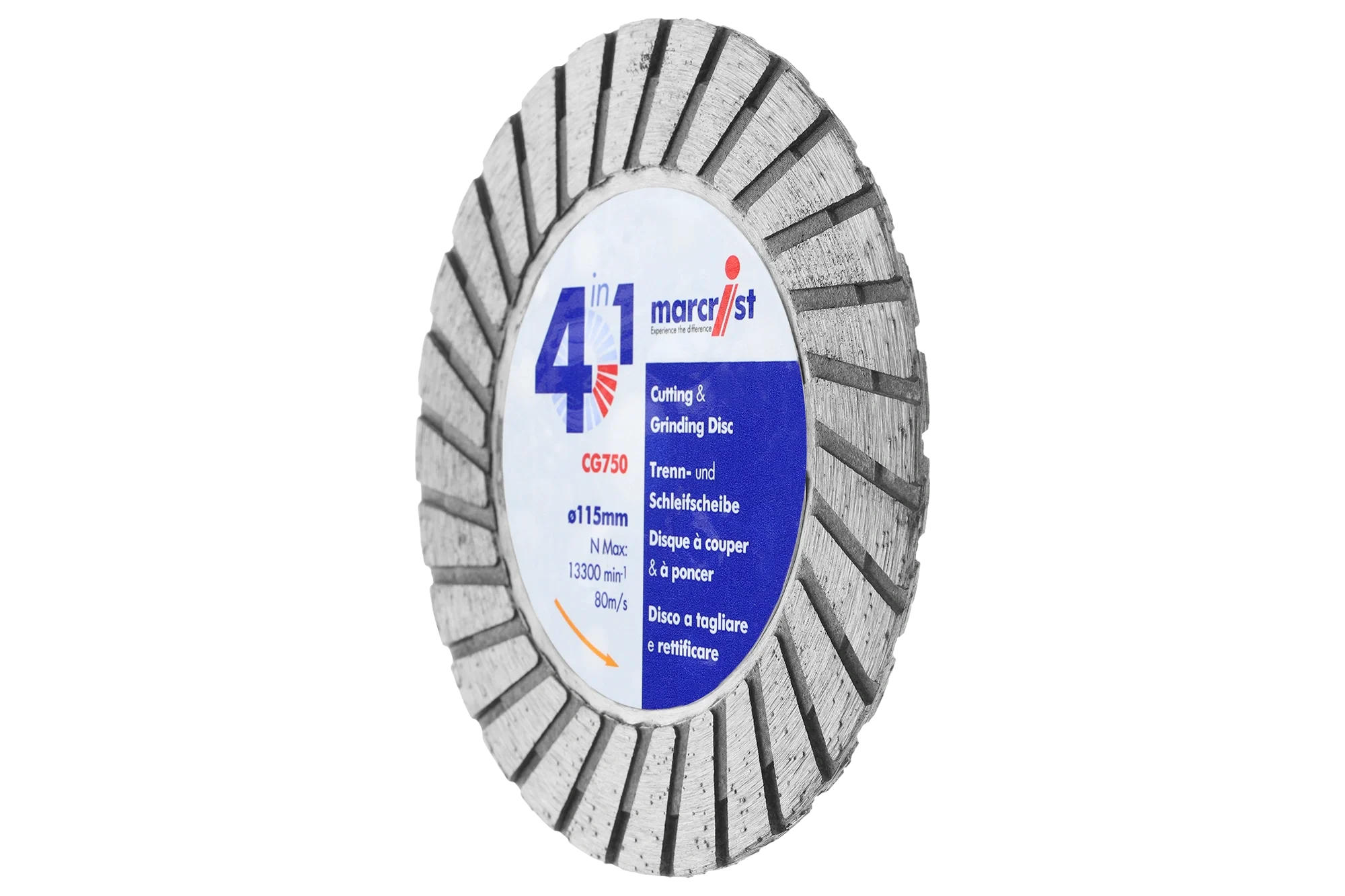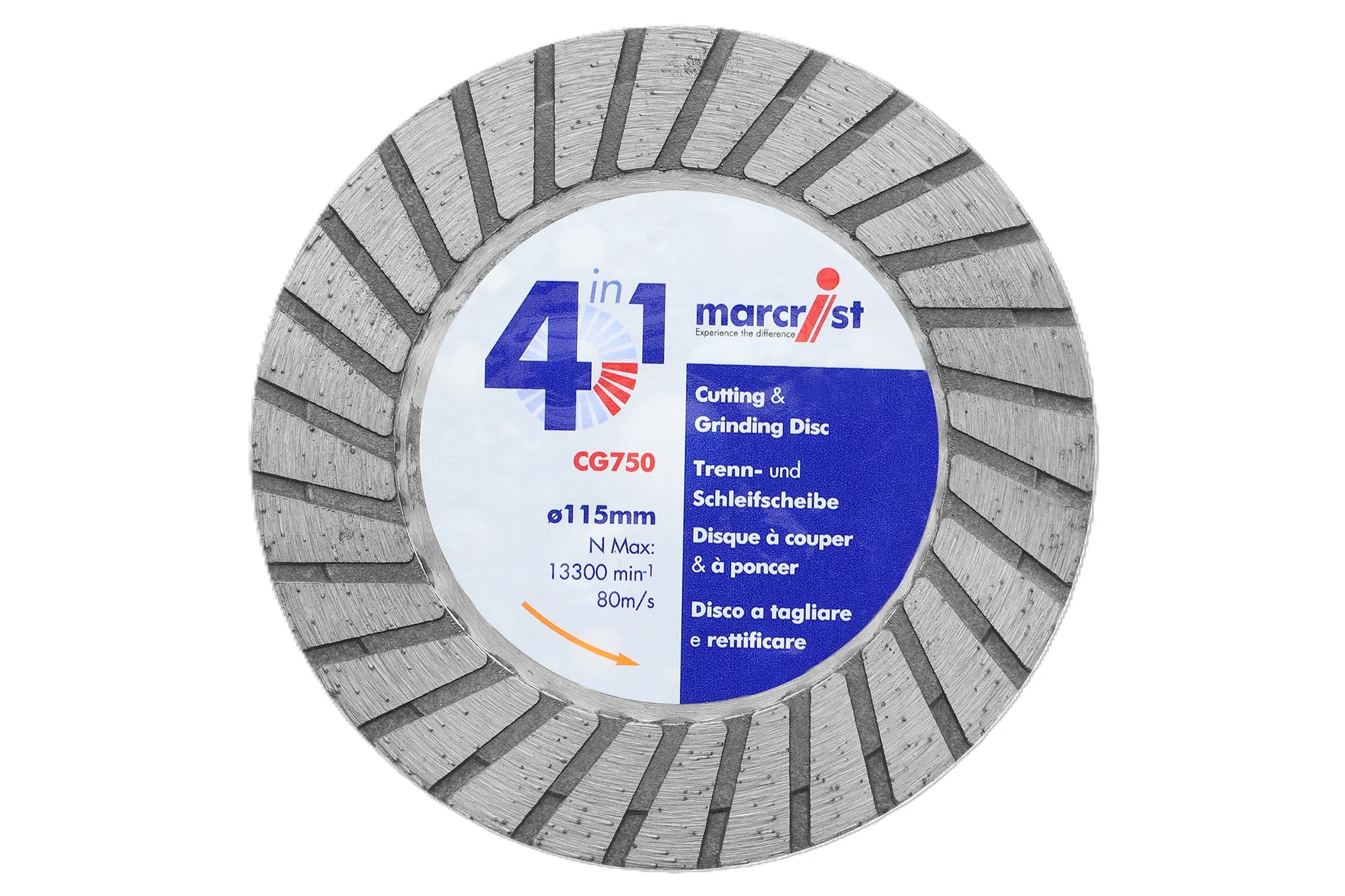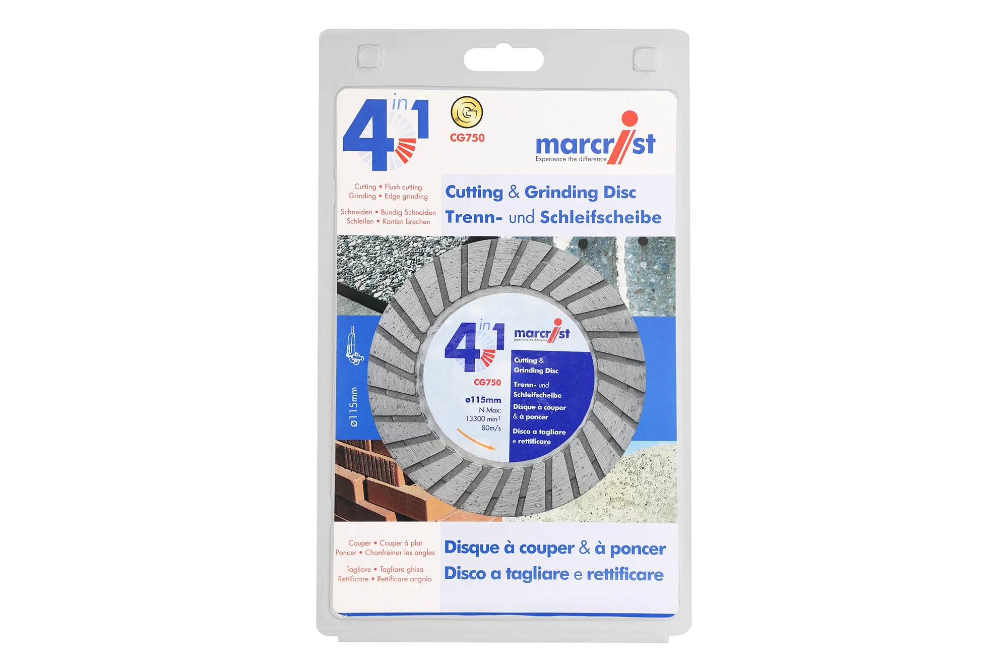 Cutting – flush cutting – grinding and edge grinding with one blade. CG750: 4 in 1. No jamming in the cut. Flush cutting. Cuts and grinds everything! 25mm diamond segment. reinforced nut flange for direct mount to the angle grinder.