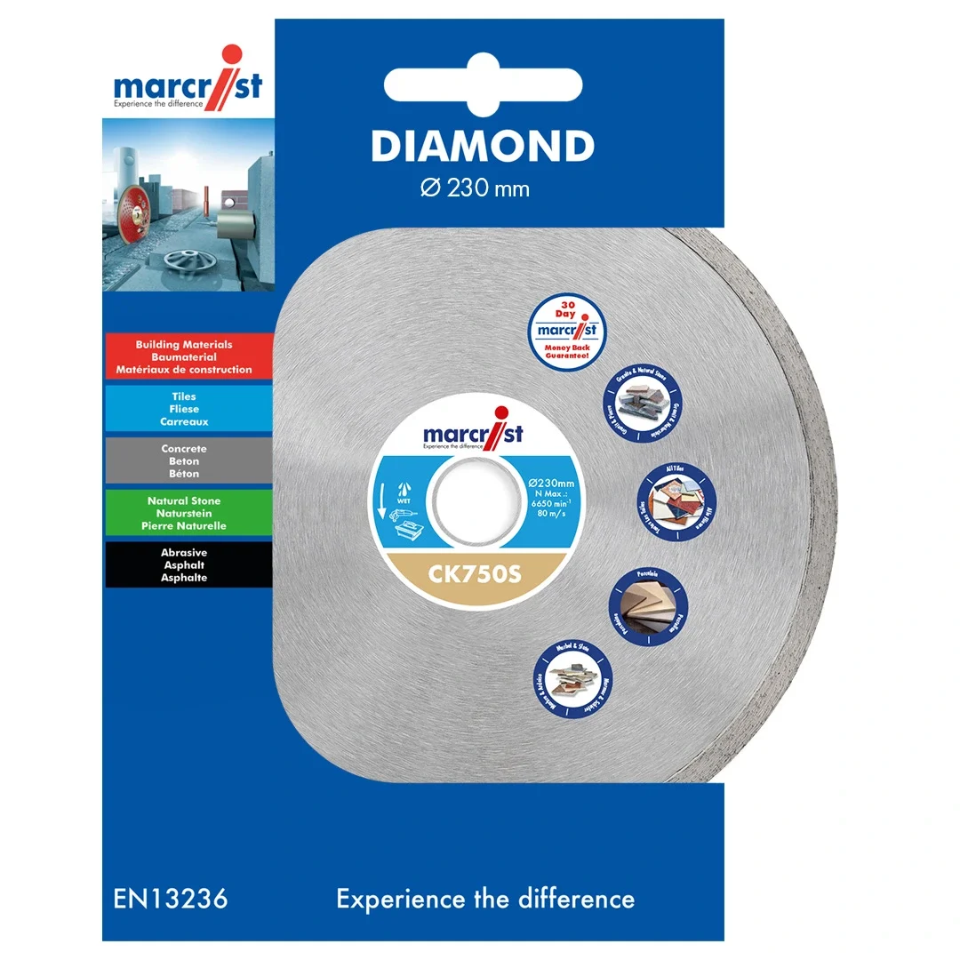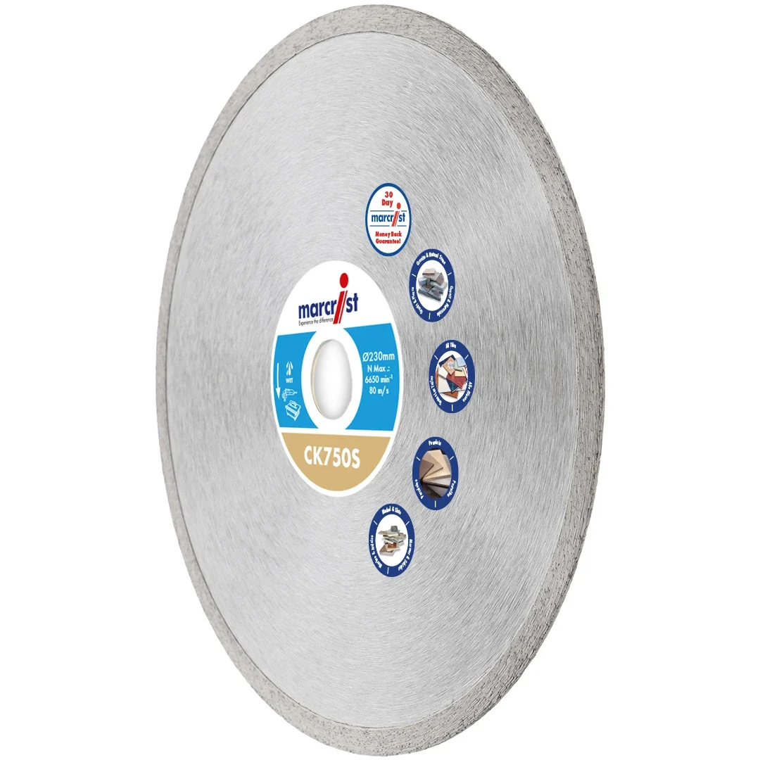Premium precision diamond cutting blade with smooth rim for ultimate chip-free cutting. For use with tiles, Ceramics, glazed ceramics, mosaics, natural stone and marble