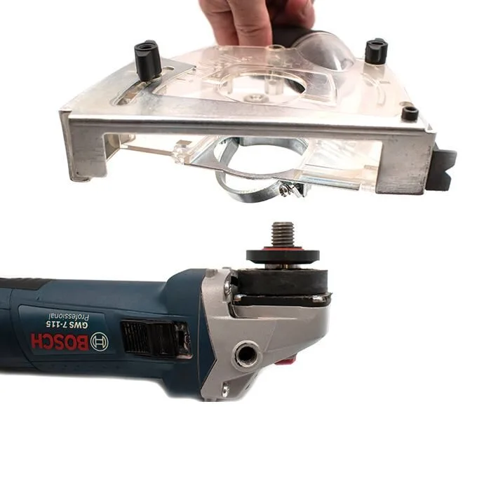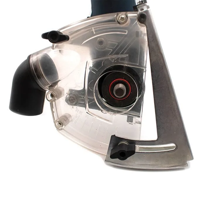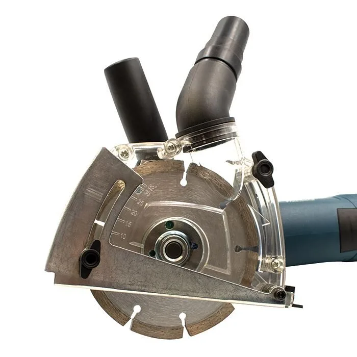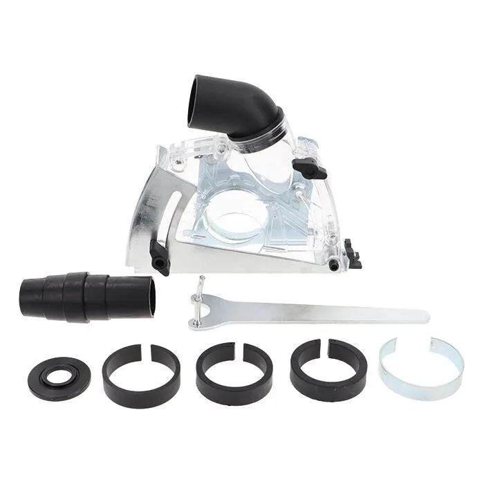 Transparent Precision Cutting and Dust Control Set. Ø 115mm (4 1/2″) and Ø 125mm (5″) Transparent housing for cutting tool visibility. Precision setting for controlled cutting depth. Contains: Cutting & dust control set, dust stud to connect the vacuum cleaner, 4 connection sleeves for most angle grinder, 2 pin spanner, flange nut