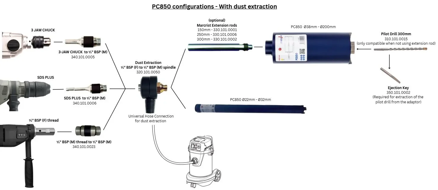 ½" BSP (F) to ½" BSP (M) spindle. Professional Dust Free Dry Drilling