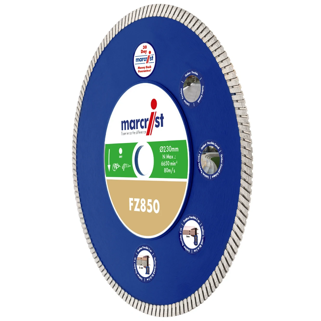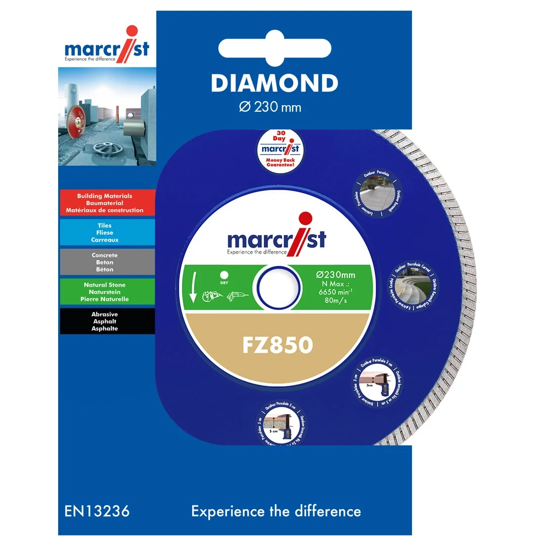 Cuts outdoor porcelain slabs dry or wet, extremely fast, and without chipping