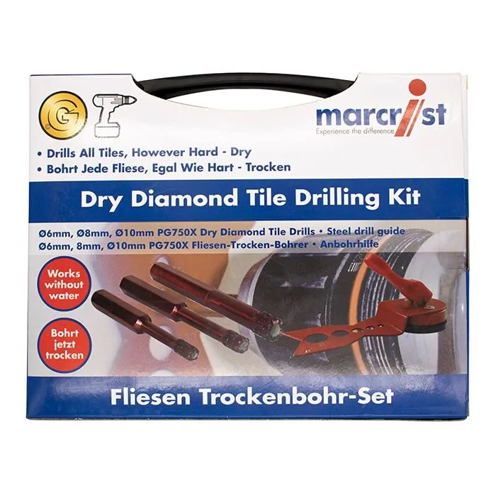 4 Piece Complete Set with Professional Drill Guide and Ø 6mm, Ø 8mm, Ø 10mm PG750X Hex Diamond Porcelain Dry Drills with Hexagonal Shaft. Drills hardest porcelain with ease. Ideal RPM: > 2500 RPM. Each drill lasts 60 – 100 holes in hardest porcelain