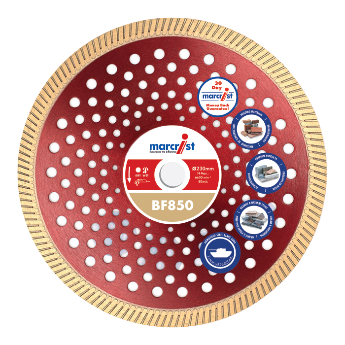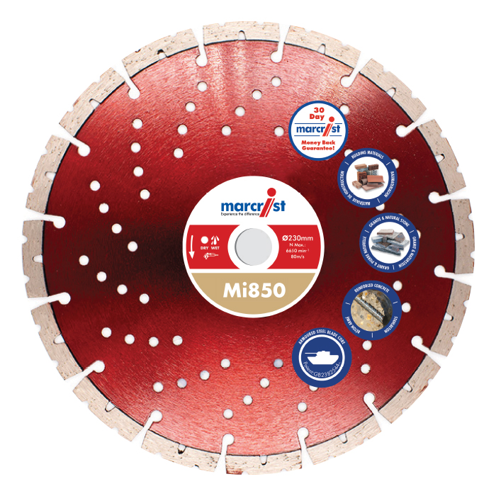 Block Pavers, Blockwork, Building Materials, Cast Concrete, Class A Engineering Bricks, Class B Engineering Bricks -BF850, Clay Roof Tiles - BF850, Concrete, Concrete Pipes, Concrete Roof Tiles, Concrete with Steel, Corrugated Sheet Metal - BF850, Cut it all - BF850, Dry Wall - BF850, Extreme Reinforced, Extremely Hard Building Materials, Facing Bricks - BF850, General Purpose - Mi850, Granite, Hard Concrete, Indian Sandstone, Lignacite Blocks - Mi850, Masonry, Natural Stone, Plasterboard - BF850, Prestressed Concrete, Reinforced Concrete, Sandwich Materials - Mi850, Sheet Metal - BF850, Universal - BF850, Unreinforced Concrete